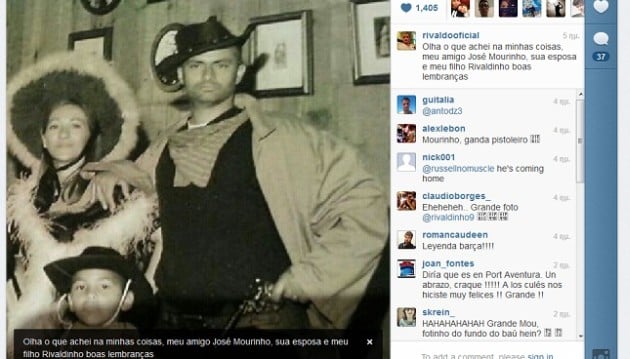 Ο «Ρίμπο» και ο τεχνικός της Ρεάλ Μαδρίτης συνδέονται από τότε με δυνατή φιλία, κάτι που παραδέχθηκε ο ίδιος ο ποδοσφαιριστής της Σάο Πάολο όταν ανέβασε στον προσωπικό του λογαριασμό μια εντυπωσιακή φωτογραφία από τα παλιά. Σε αυτήν, ο Μουρίνιο ποζάρει για τον φωτογραφικό φακό στο πλευρό της τότε συζύγου του, Ματίλντε Φαρία, και μπροστά από τον γιο του Ριβάλντο, τον Ριβαλντίνιο. Ακόμη εντυπωσιακότερη είναι όμως η… ενδυμασία των τριών πρωταγωνιστών! Ο Μουρίνιο είναι γνωστό ότι βγάζει… πιστόλια όταν θεωρήσει ότι θίγεται και «πυροβολεί» προς πάσα κατεύθυνση, αλλά στην εν λόγω φωτογραφία είναι ντυμένος καουμπόι και με οπλισμένο το… όπλο στο χέρι, από μια επίσκεψη που έκαναν οι δύο οικογένειες στο θεματικό πάρκο Port Aventura, περίπου μία ώρα μακριά από τη Βαρκελώνη!