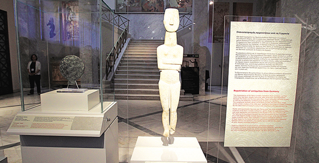 Μόνιμα εκθέματα του Εθνικού Αρχαιολογικού Μουσείου είναι πλέον δύο αριστουργήματα του Πρωτοκυκλαδικής περιόδου που επαναπατρίστηκαν από τη Γερμανία την περασμένη Παρασκευή. Πρόκειται για κειμήλια -το μεν πρώτο θεωρείται ένα από τα μεγαλύτερα σωζόμενα μαρμάρινα κυκλαδικά ειδώλια και το άλλο συγκαταλέγεται ανάμεσα στα λιγοστά λίθινα τηγανόσχημα σκεύη που έχουν βρεθεί- που αγοράστηκαν το 1975 από το κρατικό μουσείο της Βάδης στην Καρλσρούη, όπου παρέμειναν 38 ολόκληρα χρόνια.