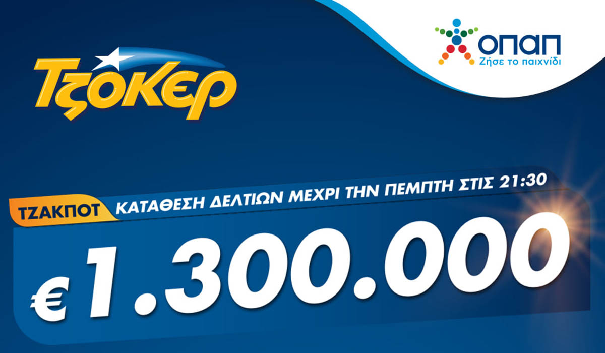 Το τέταρτο τζακ ποτ στο ΤΖΟΚΕΡ την περασμένη Τρίτη ανέβασε το διανεμόμενο ποσό της σημερινής κλήρωσης σε 1,3 εκατ. ευρώ. Όσοι θέλουν να διεκδικήσουν το μεγάλο έπαθλο του παιχνιδιού, αλλά δεν προλαβαίνουν να επισκεφθούν το πλησιέστερο κατάστημα ΟΠΑΠ για να συμπληρώσουν το δελτίο τους, μπορούν να δοκιμάσουν την τύχη τους μέσω διαδικτύου. Με λίγα κλικ στο tzoker.gr ή στην εφαρμογή ΤΖΟΚΕΡ έως τις 21:30, διεκδικούν το ποσό του 1,3 εκατ. ευρώ, καθώς και όλα τα μικρότερα έπαθλα του παιχνιδιού.