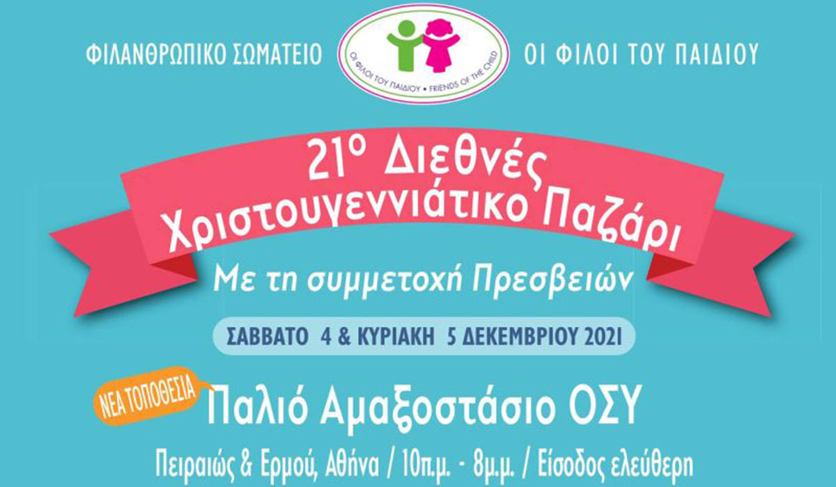 Το Φιλανθρωπικό Σωματείο «Οι Φίλοι του Παιδιού», θέλοντας να ενισχύσει το έργο του, πραγματοποιεί το καθιερωμένο Διεθνές Χριστουγεννιάτικο Bazaar του, στις 4 & 5 Δεκεμβρίου, στο Παλιό Αμαξοστάσιο Ο.ΣΥ. στον Κεραμεικό, Πειραιώς & Ερμού.