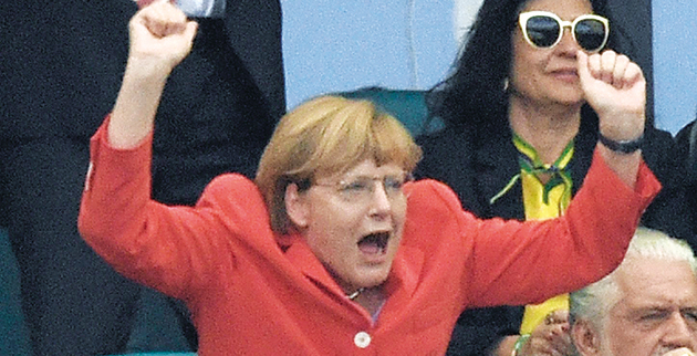 Μήνυμα ισχύος από το πρώτο της κιόλας παιχνίδι στον (έβδομο) όμιλο έστειλε η Γερμανία. Η ομάδα του Γιόακιμ Λεβ, υπό το βλέμμα της Ανγκελα Μέρκελ (φωτό) που βρισκόταν στις εξέδρες και πανηγύριζε έντονα τα γκολ, θριάμβευσε χθες 4-0 επί της Πορτογαλίας έχοντας σε εξαιρετική ημέρα τον Τόμας Μίλερ. Ο 24χρονος επιθετικός της Μπάγερν έκανε χατ τρικ (12′ πέν., 45′, 78′), ενώ το άλλο τέρμα των «πάντσερ» σημείωσε ο Χούμελς (32′). Οι οιωνοί για τους Πορτογάλους δεν ήταν καλοί από το ξεκίνημα. Στο 12′ βρέθηκαν πίσω στο σκορ από ένα πολύ αυστηρό πέναλτι που έδωσε ο Σέρβος Μάζιτς σε μαρκάρισμα του Ζοάο Περέιρα επάνω στον Γκέτσε κι ακολούθησε (28′) αναγκαστική αλλαγή λόγω τραυματισμού του Αλμέιδα. Τα πράγματα έγιναν χειρότερα για την ομάδα του Πάολο Μπέντο στο 37′, όταν αποβλήθηκε (με απευθείας κόκκινη) ο Πέπε για κουτουλιά στον Μίλερ. Κάπου εκεί οι Ιβηρες πέταξαν λευκή πετσέτα και μοιραία γνώρισαν βαριά ήττα στην πρεμιέρα του ομίλου.