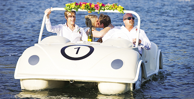 Ρομαντικές βαρκάδες για νεόνυμφα ζευγάρια μέσα σε γαμήλια στολισμένους θαλάσσιους «σκαραβαίους» έχουν ξετρελάνει ντόπιους και τουρίστες στο Αργοστόλι Κεφαλλονιάς! Ενα ζευγάρι Βρετανών που ενώθηκαν με τα δεσμά του γάμου στο πανέμορφο νησί του Ιονίου έκανε το πρώτο μίνι ταξίδι του μέλιτος στη λιμνοθάλασσα Κουτάβου μέσα σε πρωτότυπο, ποδοκίνητο σκαραβαίο.