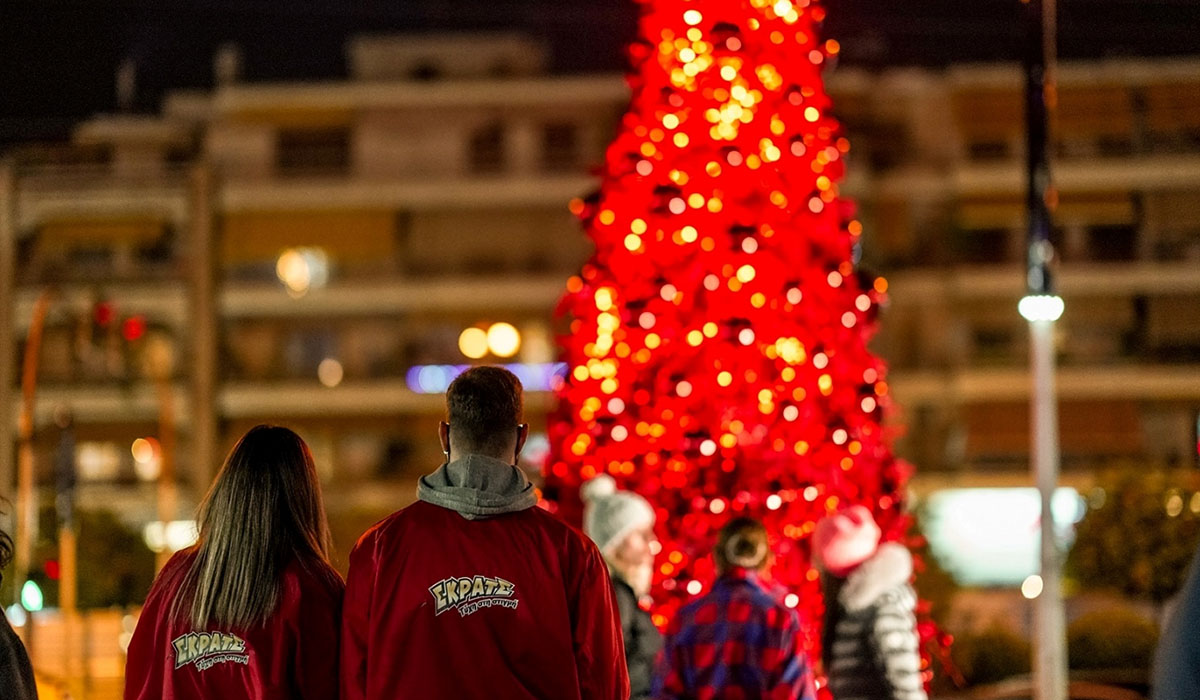 Το κατακόκκινο δέντρο του ΣΚΡΑΤΣ δημιουργεί ένα άκρως εορταστικό κλίμα στην πλατεία Μανδηλαρά, στο Γαλάτσι, και γεμίζει με χριστουγεννιάτικο χρώμα τις φωτογραφίες κατοίκων και επισκεπτών.