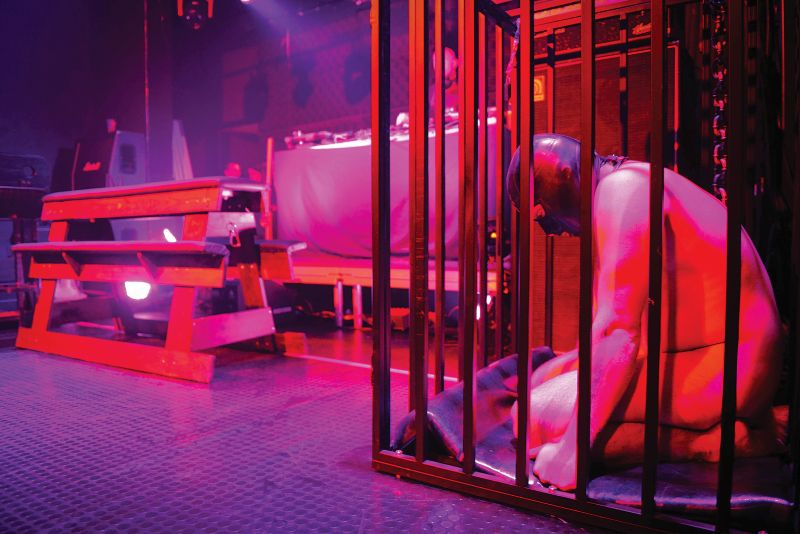 Το «παιχνίδι», όμως, πέρασε σε άλλο επίπεδο όταν πάνω στη σκηνή τοποθετήθηκε ένα μεταλλικό κλουβί, και μέσα σε αυτό μπήκε ένας ημίγυμνος σκλάβος με μαύρη βινίλ μάσκα και ένα πλαστικό ομοίωμα πέους ανάμεσα στα οπίσθιά του! Μετά το ανελέητο ξύλο που έφαγε ο σκλάβος με κάθε λογής μαστίγιο, η αφέντρα, η οποία φορούσε ένα αποκαλυπτικό latex κορμάκι, άρχισε να ρίχνει σταγόνες αναμμένου κεριού πάνω στο κορμί του υποταγμένου άνδρα, ο οποίος έφτασε σε σεξουαλικό οργασμό!