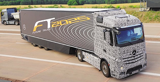 Το Future Truck 2025, όπως ονομάστηκε το πρωτότυπο που παρουσιάστηκε σε γερμανικό αυτοκινητόδρομο, αποτελεί ακόμα ένα μεγάλο βήμα στην ανάπτυξη αυτοοδηγούμενων οχημάτων. Στη διάρκεια της δοκιμής ο οδηγός του Χανς Λουφτ έπαιζε προκλητικά με το iPad του ενώ βρισκόταν πίσω από το τιμόνι τού βάρους 40 τόνων φορτηγού που κινούνταν σε δρόμο ταχείας κυκλοφορίας, υπό το επιδοκιμαστικό βλέμμα του διευθύνοντος συμβούλου της Daimler Trucks Βόλφγκανγκ Μπέρνχαρντ.
