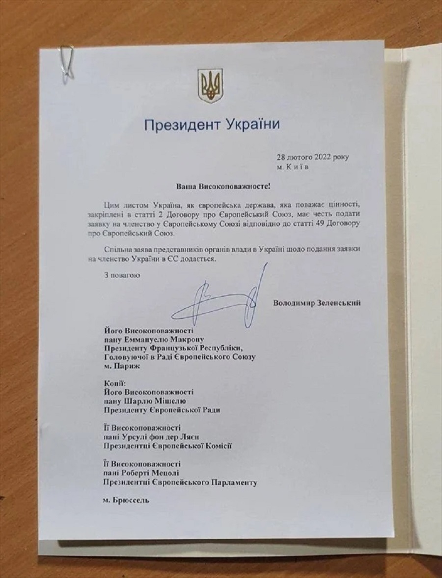 Το απόγευμα της Δευτέρας ο πρόεδρος της Ουκρανίας, Βολοντίμιρ Ζελένσκι υπέγραψε αίτηση για την ένταξη της Ουκρανίας στην Ευρωπαϊκή Ένωση. Την είδηση ανακοίνωσε το ουκρανικό κοινοβούλιο.