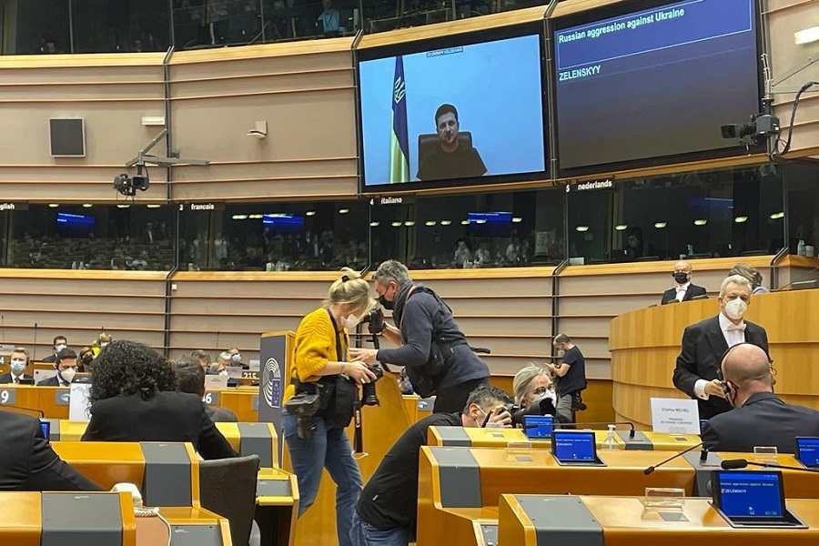 Ο Βλοντιμίρ Ζελένσκι μίλησε το Ευρωπαϊκό Κοινοβούλιο για τη ρωσική εισβολή στην Ουκρανία και μετά το τέλος της ομιλίας του σηκώθηκαν όρθιοι και τον καταχειροκρότησαν.