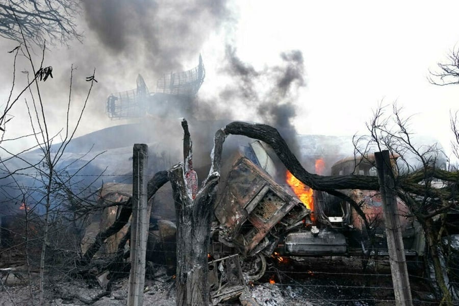 Την ώρα που μιλούσε, προέκυψε η είδηση ότι ρωσικός πύραυλος έπληξε τον πύργο τηλεπικοινωνιών στην ουκρανική πρωτεύουσα.