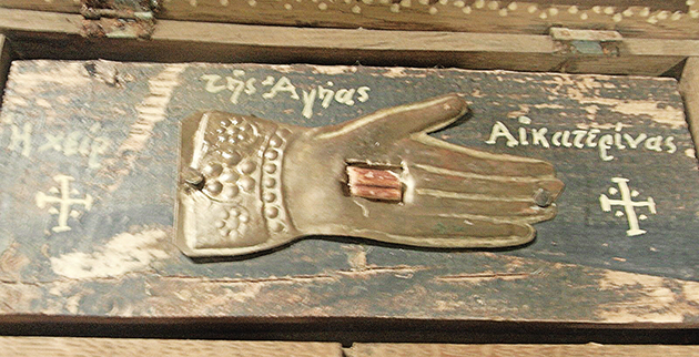 Σύμφωνα με την περιγραφή που δίνει ο πωλητής, πρόκειται για μια ορθόδοξη λειψανοθήκη («reliquary box») με διαστάσεις 22 x11 εκατοστά, που περιέχει ένα χοντρό κομμάτι ξύλου με την επιγραφή στα ελληνικά «το χέρι της Αγίας Αικατερίνης» (όπως φαίνεται από τη φωτογραφία, η ακριβής επιγραφή είναι «Η χειρ της Αγήας Αικατερίνας»)! Ο πωλητής συνεχίζει την περιγραφή αναφέροντας ότι στο κέντρο υπάρχει ένα ασημένιο χέρι με μια ορθογώνια οπή, η οποία περιέχει τμήμα ιερού λειψάνου («a piece of holy relic»), ενώ στο κάλυμμα υπάρχει μια εικόνα της αγίας, ζωγραφισμένη σε καμβά.