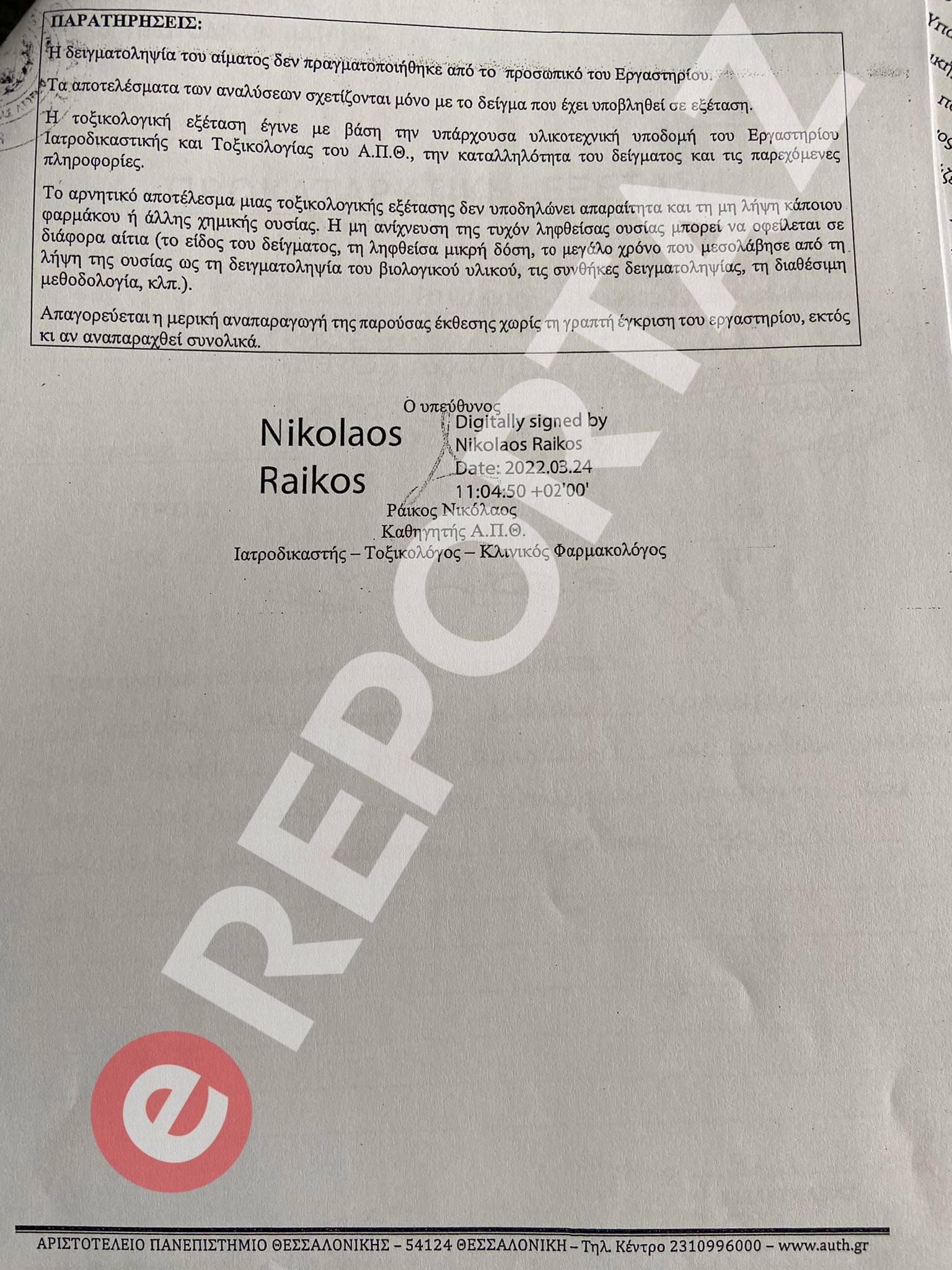 Το αρνητικό αποτέλεσμα μιας τοξικολογικής εξέτασης δεν υποδηλώνει απαραίτητα και τη μη λήψη κάποιου φαρμάκου ή άλλης χημικής ουσίας. Η μη ανίχνευση της τυχόν ληφθείσας ουσίας μπορεί να οφείλεται σε διάφορα αίτια (το είδος του δείγματος, τη ληφθείσα μικρή δόση, το μεγάλο χρόνο που μεσολάβησε από τη λήψη της ουσίας ως τη δειγματοληψία του βιολογικού υλικού, τις συνθήκες δειγματοληψίας , τη διαθέσιμη μεθοδολογία κλπ)».
