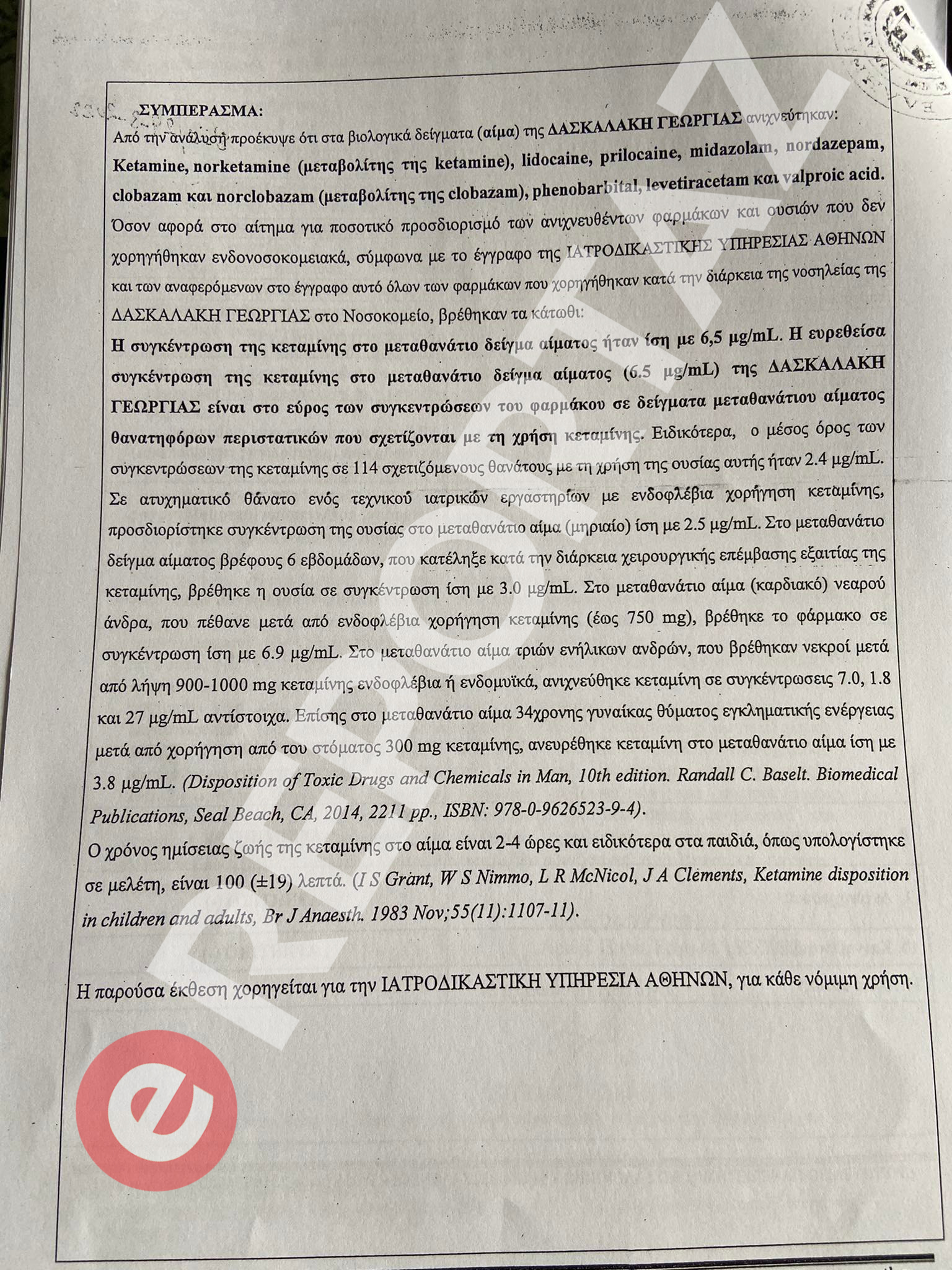 «Από την ανάλυση προέκυψε ότι στη βιολογικά δείγματα (αίμα) της ΔΑΣΚΑΛΑΚΗ ΓΕΩΡΓΙΑΣ ανιχνεύτηκαν Ketamine, norketamine (μεταβολίτης της ketamine), Hdocaine, prilocaine, midazolunt, nordazepam, clobazam και noretobazam (μεταβολίτης της elotaram), phenobarbital, levetiracetam και valprole acid. Όσον αφορά στο αίτημα για ποσοτικό προσδιορισμό των ανιχνευθέντων φαρμάκων και ουσιών που δεν χορηγήθηκαν ενδονοσοκομειακά, σύμφωνα με το έγγραφο της ΙΑΤΡΟΔΙΚΑΣΤΙΚΗΣ ΥΠΗΡΕΣΙΑΣ ΑΘΗΝΩΝ και των αναφερόμενων στο έγγραφο αυτό όλων των φαρμάκων που χορηγήθηκαν κατά την διάρκεια της νοσηλείας της ΔΑΣΚΑΛΑΚΗ ΓΕΩΡΓΙΑΣ στο Νοσοκομείο, βρέθηκαν τα κάτωθι: