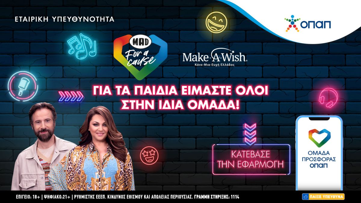 Τέσσερα παιδιά του Make-A-Wish (Κάνε-Μια-Ευχή Ελλάδος), που πάσχουν από σοβαρά νοσήματα, θα δουν τις ευχές τους να γίνονται πραγματικότητα μέσα από την πρωτοβουλία “MAD For a Cause”, που υλοποιεί ο ΟΠΑΠ με την υποστήριξη του MAD. Στην εκπλήρωση των παιδικών ευχών μπορούμε να συμβάλουμε όλοι δωρεάν, μπαίνοντας στην «Ομάδα Προσφορά ΟΠΑΠ». Παράλληλα, διεκδικούμε δύο δώρα εμπειρίας από την Καίτη Γαρμπή και τον Κωστή Μαραβέγια, οι οποίοι υποστηρίζουν τη σημαντική πρωτοβουλία του ΟΠΑΠ για παιδιά.