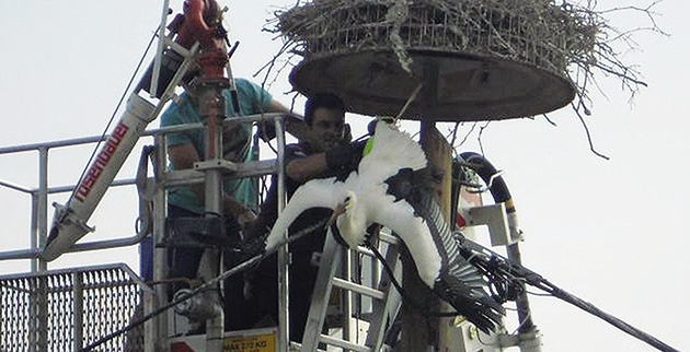 Το μετέωρο… βήμα των συμπαθών πτηνών φαίνεται πως τα έκανε να χάσουν την ισορροπία τους και για ώρες κρέμονταν από τα μικρά καλώδια που προεξείχαν κάτω από τη φωλιά τους. Περαστικοί που είδαν τους πελαργούς ειδοποίησαν την Πυροσβεστική και λίγο αργότερα κατέφθασαν στο σημείο άνδρες της 7ης ΕΜΑΚ με καλαθοφόρο όχημα, οι οποίοι με τη βοήθεια της ΔΕΗ κατάφεραν να απεγκλωβίσουν τα πτηνά και να τα βάλουν πίσω στη φωλιά τους.
