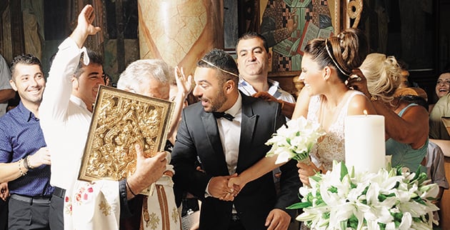 Ο γάμος τελέστηκε στον Ιερό Ναό των Αγίων Κωνσταντίνου και Ελένης στα Λουτρά Υπάτης, στη Λαμία, με κουμπάρα τη δικαστικό Ελενα Μπαρκούζου, η οποία -ευτυχώς- γλίτωσε από το «άγριο» έθιμο. Το ζευγάρι πρωτοτύπησε και εμφανίστηκε παρέα στην εκκλησία, με τη νύφη μάλιστα να οδηγεί το πολυτελές αυτοκίνητο μάρκας Mercedes!