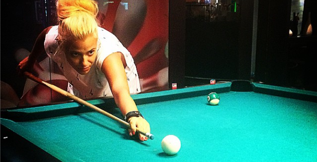 Το ύφος είναι σωστό, όπως και ο τρόπος που κρατάει τη στέκα και κοιτάζει με προσοχή και αφοσίωση τις μπάλες. Η Λάουρα Νάργες μυείται στον κόσμο του αμερικανικού μπιλιάρδου και ποζάρει σαν επαγγελματίας παίκτρια, έτοιμη να «σπάσει» το τρίγωνο. Αυτό που θα θέλαμε βέβαια να μάθουμε είναι αν έβαλε καμιά μπάλα στις τρύπες του τραπεζιού, γιατί συνήθως αυτές οι πόζες είναι της λογικής «πολύ λάδι και από τηγανίτα τίποτα».
