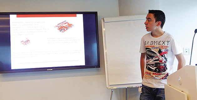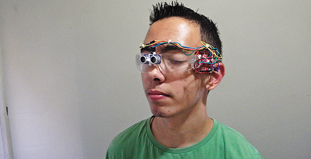 Το πρωτοποριακό πρότζεκτ ονομάζεται PEACE (Portable Evasive Assistance). Πρόκειται για γυαλιά που χρησιμοποιούν υπερήχους για να εντοπίζουν εμπόδια στο περιβάλλον ενός ατόμου με σοβαρό πρόβλημα όρασης και να τον προειδοποιούν για την ύπαρξή τους. Προκειμένου να μην αποσπάται η προσοχή του χρήστη, η επισήμανση του εμποδίου δεν γίνεται με ηχητικό σήμα αλλά με δόνηση που παράγεται από ένα μικρό ενσωματωμένο μοτέρ. Μεταξύ άλλων, η συσκευή περιλαμβάνει αισθητήρα υπερήχων και έναν επεξεργαστή σε πλακέτα Redboard Arduino, που προγραμμάτισε ο ίδιος ο μαθητής.