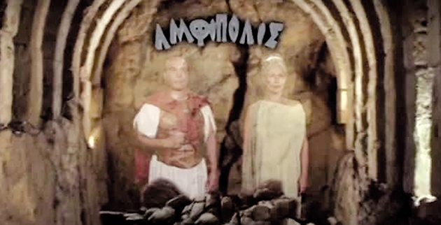 Η λέξη «Αμφίπολη» είναι γραμμένη με αρχαϊκή γραμματοσειρά και ένας σεισμός «κουνάει» τα γράμματα. Το φι πέφτει στα πόδια του Φώτη και το μι στα πόδια της Μαρίας, ενώ το λάμδα παίρνει τη θέση του στη λέξη «λάιβ». Εννοείται, βέβαια, ότι παρουσιαστές και τεχνικοί το διασκέδασαν μέχρι δακρύων στο γύρισμα.