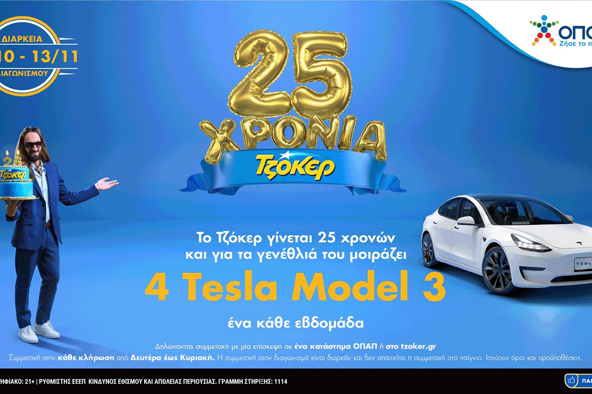 Λίγα 24ωρα έχουν μείνει για τη μεγάλη κλήρωση του ΤΖΟΚΕΡ που θα αναδείξει τον πρώτο τυχερό που θα κερδίσει ένα TESLA Model 3. Το παιχνίδι του ΟΠΑΠ γιορτάζει τα 25α γενέθλιά του και μοιράζει συνολικά 4 TESLA σε ισάριθμες εβδομαδιαίες κληρώσεις.