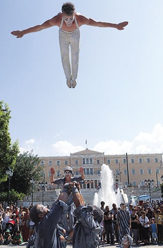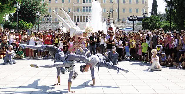 Και ξαφνικά η πλατεία Συντάγματος γέμισε με ακροβάτες του Cirque du Soleil! Μια πρώτη γεύση από το πολυαναμενόμενο σόου τους με τίτλο «Quidam», που θα κάνει πρεμιέρα στις 20 Σεπτεμβρίου στο κλειστό γήπεδο μπάσκετ του ΟΑΚΑ, μας έδωσαν το περασμένο Σάββατο οι περφόρμερ του καναδέζικου θιάσου, παρουσιάζοντας live ένα από τα πιο δημοφιλή νούμερά τους: το «Banquine».