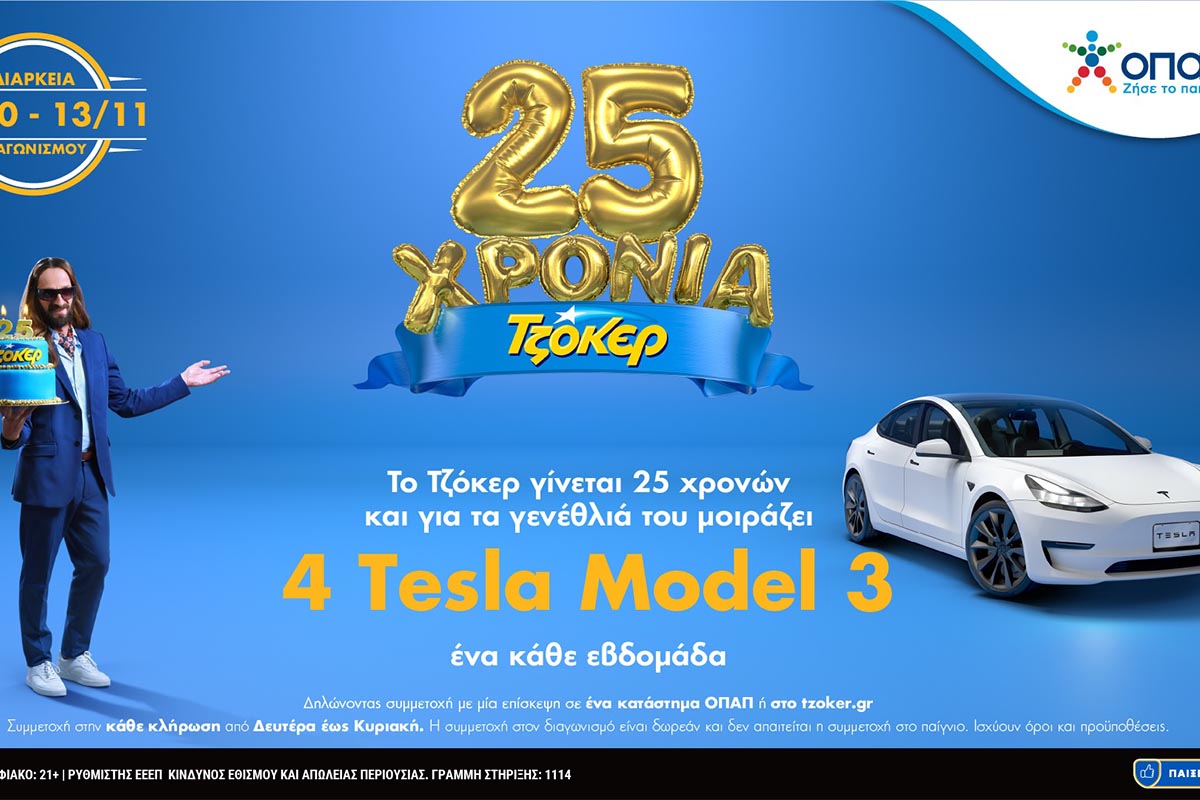 Με αφορμή την επέτειο των 25 χρόνων, το ΤΖΟΚΕΡ μοιράζει συνολικά 4 TESLA Model 3 μέσα από ισάριθμες εβδομαδιαίες κληρώσεις.