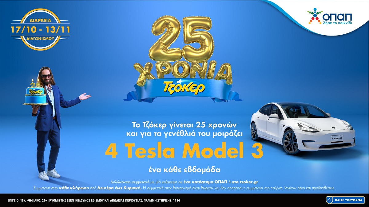 Με αφορμή την επέτειο των 25 χρόνων, το ΤΖΟΚΕΡ μοιράζει συνολικά 4 TESLA Model 3 μέσα από ισάριθμες εβδομαδιαίες κληρώσεις.