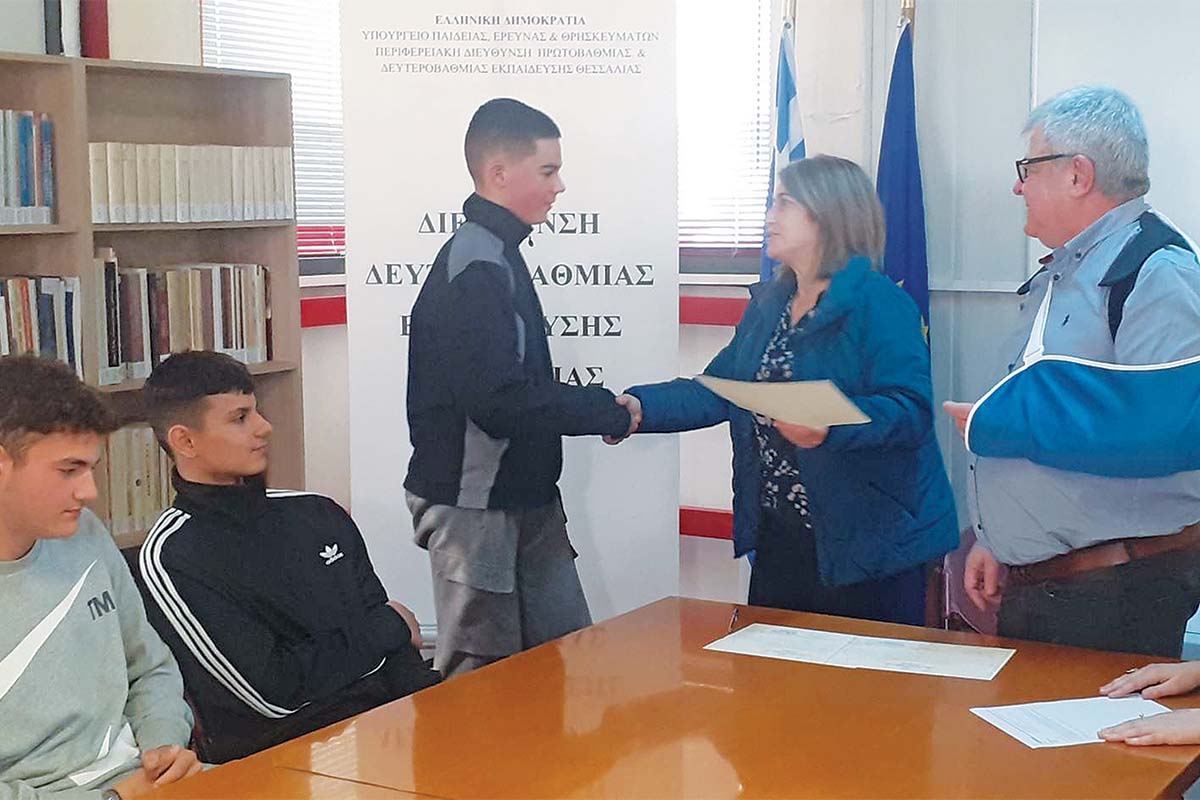 Πρόκειται για τους Χρήστο Πούλιο, μαθητή της Β’ τάξης του Γυμνασίου Κάτω Λεχωνίων, Ιωάννη Γεράσιμο Αναστασίου, μαθητή της Γ’ τάξης του Γυμνασίου Κάτω Λεχωνίων, και Κωνσταντίνο Μουράβα, μαθητή της Α’ τάξης του 5ου ΓΕ.Λ. Βόλου, που βραβεύτηκαν προχθές το μεσημέρι από τον προϊστάμενο της Δευτεροβάθμιας Εκπαίδευσης Σωκράτη Σαβελίδη, σε μια λιτή εκδήλωση στην αίθουσα εκδηλώσεων της Δευτεροβάθμιας Εκπαίδευσης Μαγνησίας, παρουσία των γονιών τους και των διευθυντών των δύο σχολείων.