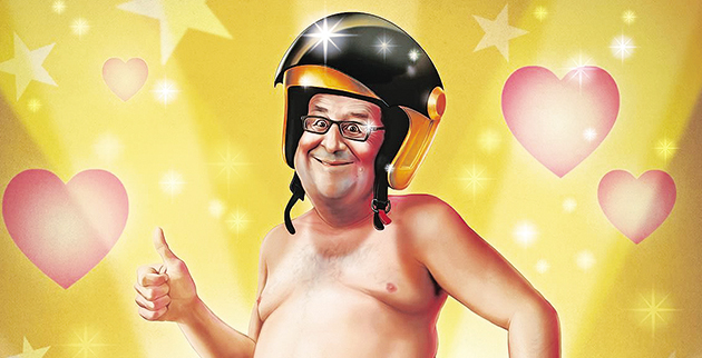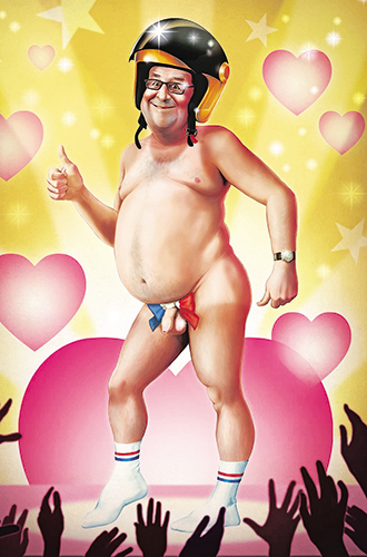 Η σατιρική προσέγγιση που παίζει στα όρια -αν δεν τα ξεπερνά- θέλει το μόριο της καρικατούρας του Φρανσουά Ολάντ να στολίζεται με κορδέλα που φέρει τα χρώματα της γαλλικής σημαίας, ενώ στο κεφάλι του φιγουράρει το κράνος με το οποίο «πρωταγωνίστησε» στο μοιραίο δημοσίευμα του «Closer» που αποκάλυπτε τη σχέση του με τη Ζιλί Γκαγέ.