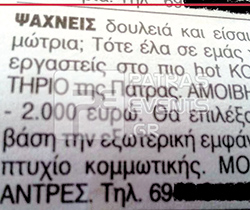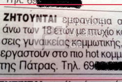 Αναζητούνται μέσω αγγελίας στην Πάτρα καλλίγραμμα κορίτσια με μισθό που φθάνει τα 2.000 ευρώ