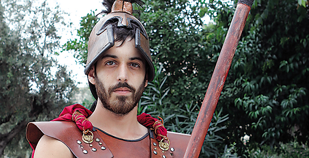 «Τη στολή τη φτιάξαμε εγώ και ο πατέρας μου. Είναι όλη χειροποίητη, με τα περισσότερα εξαρτήματα από το Μοναστηράκι. Ενας φίλος μας που γνώριζε από αυτά μάς βοήθησε να φτιάξουμε τα δερμάτινα μέρη, για την ακρίβεια τους κοιλιακούς που απαιτούσαν ειδική επεξεργασία. Το δόρυ και η ασπίδα, που ζυγίζει κοντά στα δέκα κιλά, είναι επίσης δικής μας κατασκευής!» εξηγεί ο 24χρονος, ο οποίος αρχικά εμφανίστηκε στους δρόμους της Αθήνας ως αρχαίος οπλίτης Μίλων.