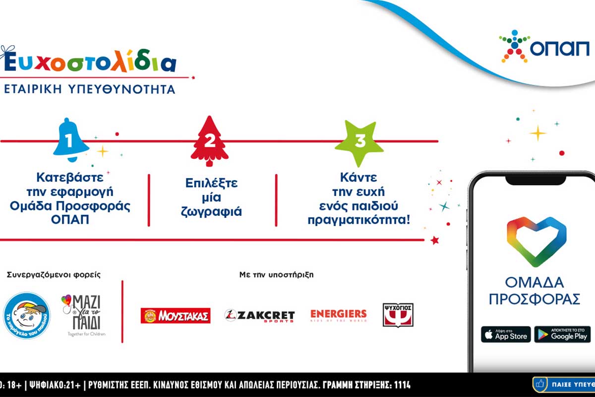 Η αντίστροφη μέτρηση για την αλλαγή του χρόνου έχει αρχίσει και μαζί έχει αρχίσει και η αντίστροφη μέτρηση χιλιάδων παιδιών που περιμένουν να ανοίξουν τα δώρα τους. Για ένατη χρονιά, ο ΟΠΑΠ, μέσα από τη δράση Ευχοστολίδια, στέκεται στο πλευρό παιδιών που έχουν ανάγκη και μας δίνει τη δυνατότητα να αναλάβουμε χρέη Άγιου Βασίλη, στέλνοντάς τους τα δώρα που ονειρεύονται. Εφέτος, η πρωτοβουλία Ευχοστολίδια πραγματοποιεί τις ευχές των παιδιών του Οργανισμού «Το Χαμόγελο του Παιδιού» και της Ένωσης «Μαζί για το Παιδί».