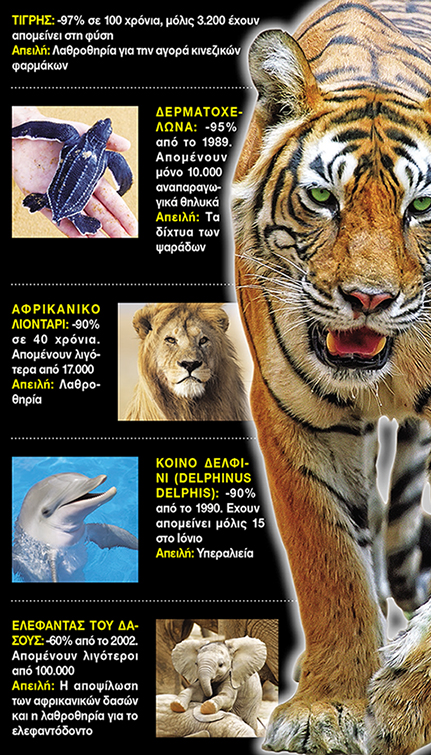 Από τα κοινά δελφίνια με το κοντό ρύγχος που απομένουν μόλις 15 στο Ιόνιο πέλαγος μέχρι τους ελέφαντες των δασών της Αφρικής, τις τίγρεις της Ινδίας και τους μεγάλους λευκούς καρχαρίες, το ήμισυ των άγριων ζώων παγκοσμίως εξαφανίστηκε σε μόλις 40 χρόνια.