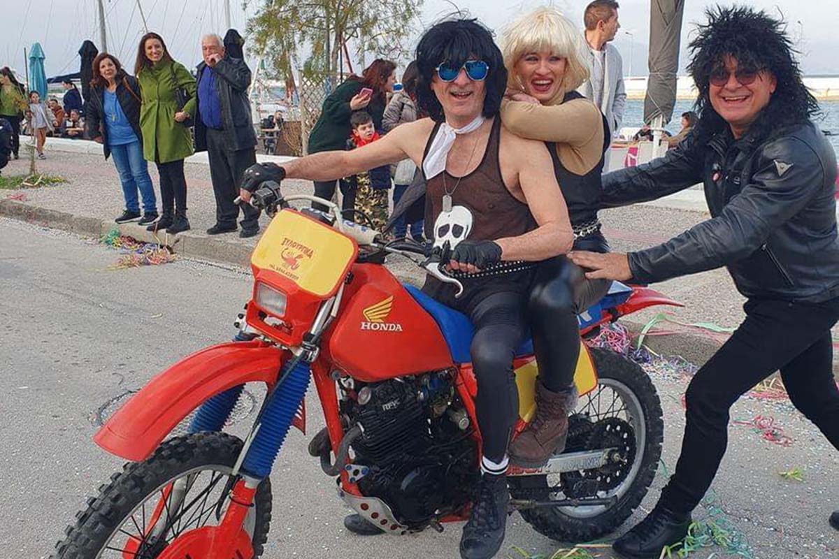 Πίσω του στη μηχανή η… Καίτη Φίνου, αγνώστων αληθινών στοιχείων, καθώς και ο άλλος μασκαράς, σύμφωνα με πληροφορίες, είναι ο… Πάνος Μιχαλόπουλος. Πολλοί κάνουν λόγο για το πόσο πολύ μοιάζει στον αγαπημένο ηθοποιό. Σίγουρα μία από τις πιο πετυχημένες μεταμφιέσεις τον φετινών Αποκριών που είδαμε.