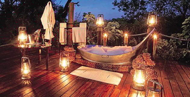 Ενα λουτρό βγαλμένο από παραμύθι είναι αυτό που προτείνει το «Sanctuary Baines’ Camp» στην Μποτσουάνα. Το «Soak», όπως λέγεται το πεντάστερο μπάνιο σε πλήρη ύπαιθρο, είναι μια εμπειρία-φαντασία! Μπανιέρα σαν σεζλόνγκ με κεριά τριγύρω και τον ουρανό για στέγη. Εμπειρία μοναδική. Φανταστική και μοναδική βέβαια είναι και η τιμή για μία νύχτα! Μόλις 1.200 ευρώ το άτομο!