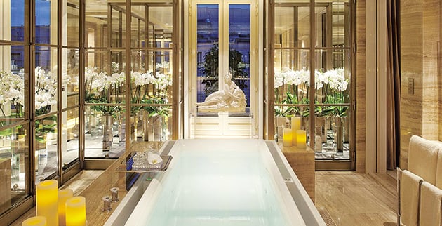 Η χλιδή από την άλλη έχει και την κλασική όψη της. Το μπάνιο του Penthouse suite στο «Four Seasons Hotel George V» στο Παρίσι είναι ό,τι πιο ακριβό υπάρχει. Στοιχίζει 19.400 ευρώ τη βραδιά, αλλά έχει και τα έξτρα του! Μαζί προσφέρουν και διαμονή σε δίκλινο.