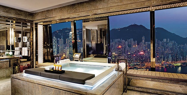 Η υπέρδιπλη μπανιέρα με το jacuzzi στο «Τhe Ritz Carlton Suite» του Χονγκ Κονγκ είναι άλλη μία μοναδική εμπειρία πολλών καρατίων! Η θέα είναι αξεπέραστη και μόνο λίγοι μπορούν να την απολαύσουν, βυθισμένοι στο νερό, με τη θερμοκρασία που επιθυμούν!