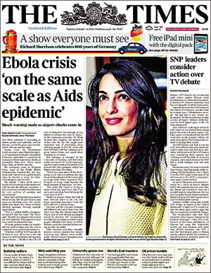 ΣΤΑ πρωτοσέλιδα των βρετανικών ΜΜΕ βρίσκεται η τριήμερη επίσκεψη της Αμάλ Κλούνεϊ στην Αθήνα, για την υπόθεση της επιστροφής των Μαρμάρων του Παρθενώνα, με τίτλους που χαρακτηρίζονται -αν μη τι άλλο- από λεπτή ειρωνεία. Οι «Times» του Λονδίνου φιλοξενούν στο πρωτοσέλιδό τους φωτογραφία της Λιβανέζας δικηγόρου από την άφιξή της στην Αθήνα γράφοντας «με το βλέμμα στραμμένο στο έπαθλο», εννοώντας -ενδεχομένως- προς την Ακρόπολη. Στο αναλυτικό ρεπορτάζ τους αναφέρουν πως η κυρία Κλούνεϊ και οι συνεργάτες της θα συμβουλεύσουν την ελληνική κυβέρνηση να κινηθεί δικαστικά. Στο κεντρικό άρθρο δε που αφιερώνει η εφημερίδα στην υπόθεση, υπογραμμίζει ότι δεν υπάρχει καλύτερο μέρος για τα Μάρμαρα, από το Βρετανικό Μουσείο.