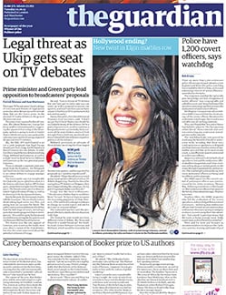 Αντιστοίχως, η «Guardian», η οποία επίσης φιλοξενεί φωτογραφία της στο πρωτοσέλιδο με τον τίτλο «Χολιγουντιανό φινάλε;», επισημαίνει σε δικό της άρθρο ότι η έλευση των Βρετανών νομικών στην Αθήνα για πολλούς είναι ήδη ένα πραξικόπημα. Η σύζυγος Κλούνεϊ περιγράφεται ως μια χρήσιμη νομικός στη μάχη για την επιστροφή των Μαρμάρων, «αφού συνδυάζει και το γκλάμουρ που η ελληνική κυβέρνηση ούτε καν θα μπορούσε να ονειρευτεί από το 2011», ενώ φιλοξενείται δήλωση του ιστορικού Χάρι Τζάλας, του πρώτου που συμβούλεψε τη Μελίνα Μερκούρη επί του θέματος, ο οποίος φαίνεται πως θεωρεί την υπόθεση χαμένη.