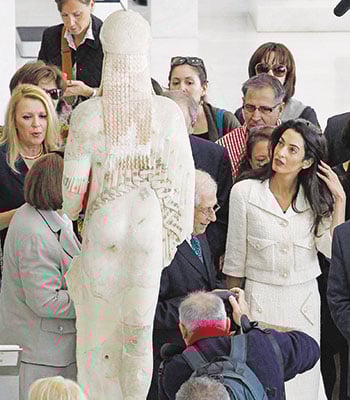 Παρατηρώντας με ιδιαίτερη προσοχή τα εκθέματα και κάνοντας λιγοστές ερωτήσεις, η κυρία Αλαμουντίν περιηγήθηκε στους χώρους, δείχνοντας ιδιαίτερο ενδιαφέρον στην αίθουσα των αρχαϊκών έργων. Μάλιστα, η γοητευτική δικηγόρος κατά τον περίπατό της δεν δίστασε να αγγίξει και το άγαλμα της Χιώτισσας, μιας εκ των εμβληματικών Κορών της Ακρόπολης.