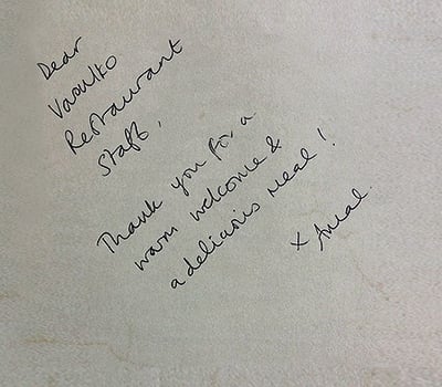 ΑΠΟΛΑΥΣΕ τις νοστιμιές του Λευτέρη Λαζάρου στο Βαρούλκο Seaside στο Μικρολίμανο και ευχαρίστησε τον Ελληνα σεφ και τους βοηθούς του με ένα ιδιόχειρο σημείωμα. «Αγαπητό προσωπικό του εστιατορίου Βαρούλκο, σας ευχαριστώ για τη ζεστή υποδοχή και το νόστιμο γεύμα. Αμάλ» έγραψε σε ένα λευκό κομμάτι χαρτί η Λιβανέζα δικηγόρος, αφού είχε γευτεί νωρίτερα αχινοσαλάτα, λαβράκι με ελληνικό παρθένο ελαιόλαδο, φιλέτα μπαρμπουνιού με μους καπνιστής μελιτζάνας και γευστικό κριθαράκι με γαρίδες Αμβρακικού, μεταξύ άλλων.