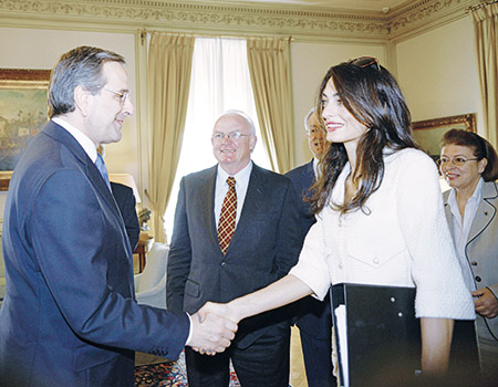 Με αέρα κομψότητας και ντυμένη με λευκό ταγέρ και μαύρες, δεκάποντες γόβες με φιόγκους, πέρασε τις πύλες του Μεγάρου Μαξίμου η Αμάλ Αλαμουντίν. Εγγλέζα στο ραντεβού της, η γοητευτική δικηγόρος έφτασε στο πρωθυπουργικό Μέγαρο στις 11.30 ακριβώς, όπως προέβλεπε και το πρόγραμμα για το προκαθορισμένο ραντεβού της με τον Αντώνη Σαμαρά.