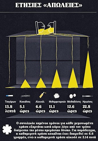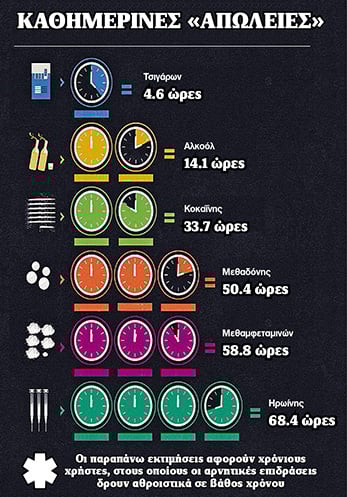 Οι δημιουργοί του site πήγαν ένα βήμα παραπέρα την έρευνά τους, υπολογίζοντας σε πόσα χαμένα λεπτά ή ώρες ζωής μεταφράζεται κάθε μεμονωμένη δόση για έναν χρήστη. Κάπως έτσι, η μία δόση κοκαΐνης οδηγεί έναν χρόνιο χρήστη πέντε λεπτά νωρίτερα στον θάνατο, ενώ μια δόση μεθαμφεταμινών στερεί από τον χρήστη 11 ώρες ζωής.