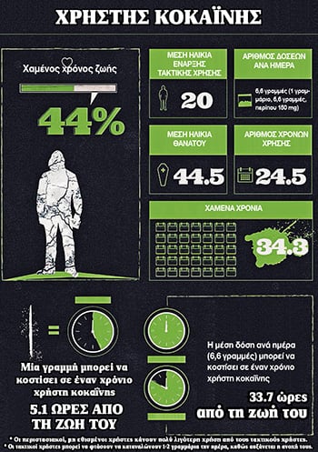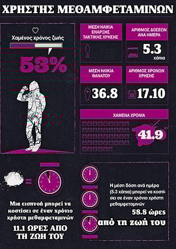 Οι αριθμοί σοκάρουν. Οι χρήστες μεθαμφεταμινών έχουν μέσο όρο ζωής τα 36,8 χρόνια, ενώ, αντίστοιχα, ο μέσος όρος ζωής για τους καπνιστές είναι 68,7 έτη, για τους αλκοολικούς τα 55,6 και για τους χρήστες κοκαΐνης τα 44,5.