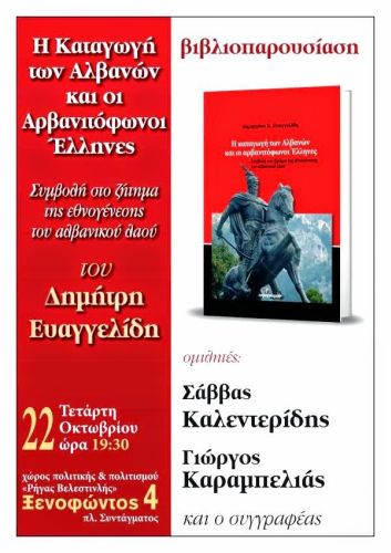Οι εκδόσεις Ινφογνώμων και ο χώρος πολιτισμού και πολιτικής «Ρήγας Βελεστινλής» πραγματοποιούν σήμερα, Τετάρτη 22 Οκτωβρίου, και ώρα 19.30 στον χώρο πολιτισμού Ξενοφώντος 4 (στην πλατεία Συντάγματος) την παρουσίαση του βιβλίου του Δημήτρη Ευαγγελίδη, με τίτλο: «Η καταγωγή των Αλβανών και οι αρβανιτόφωνοι Ελληνες – Συμβολή στο ζήτημα της εθνογένεσης του αλβανικού λαού».