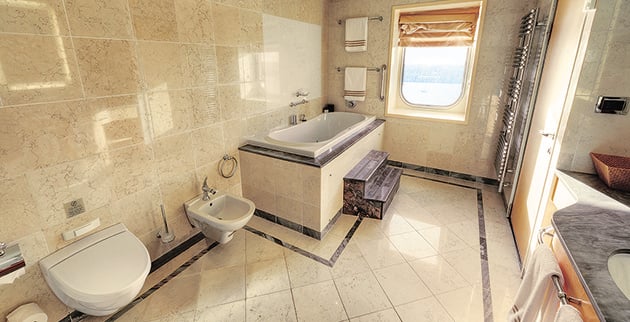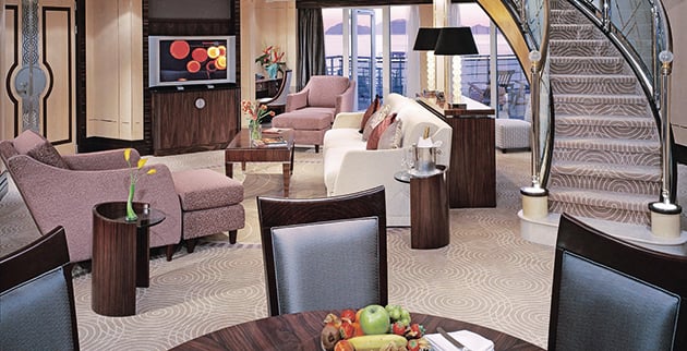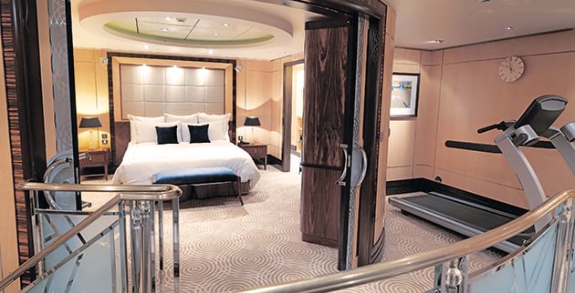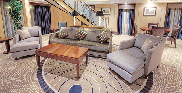 Οι υπερπολυτελείς καμπίνες δεν έχουν να ζηλέψουν τίποτα από τις ανέσεις που προσφέρουν οι σουίτες πεντάστερων ξενοδοχείων. Ξεκινώντας από το γεγονός ότι προσφέρουν στους επισκέπτες τους 200 τετραγωνικά μέτρα, δεν υπάρχει αμφιβολία ότι τους κάνουν να αισθάνονται σαν στο σπίτι τους – και ακόμα καλύτερα! Είναι μοιρασμένες σε δύο ορόφους και ενώνονται με εσωτερική επιβλητική σκάλα με μπρούντζινη κουπαστή και γυάλινα προστατευτικά, που προσδίδουν επιπλέον πολυτέλεια στη μαρμάρινη κατασκευή της.