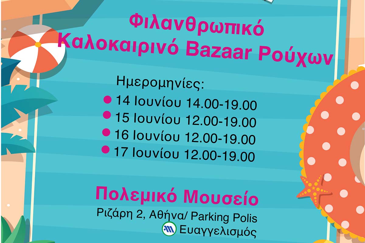Το φετινό καλοκαιρινό bazaar ρούχων θα πραγματοποιηθεί από τις 14 έως τις 17 Ιουνίου στο Πολεμικό Μουσείο, Ριζάρη 2, Αθήνα, και θα προσφέρει μια ευρεία γκάμα ρούχων και αξεσουάρ υψηλής αισθητικής και ποιότητας για άνδρες, γυναίκες και παιδιά.