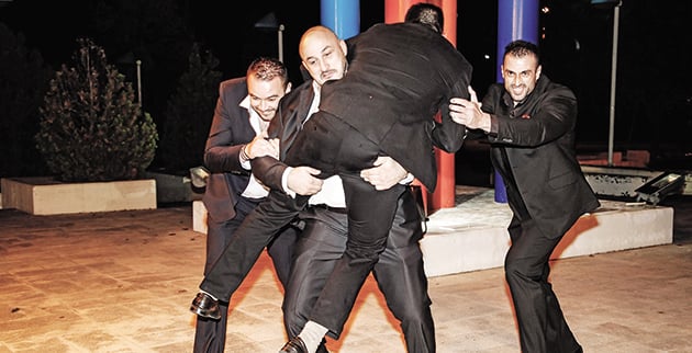 Αφού, λοιπόν, ενώθηκε με τα δεσμά του γάμου με τη γυναίκα της ζωής του, την Ευαγγελία, στον Ιερό Ναό του Αγίου Νικολάου Λάρισας και βάφτισαν τα δύο αγγελούδια τους, ο 34χρονος… γίγαντας έδωσε τη δική του παράσταση. «Επιτέθηκε» στους κουμπάρους του, δήθεν ξυλοκοπώντας τους και κάνοντάς τους επιδέξιες λαβές! Αμέσως μετά συγγενείς και φίλοι πήγαν σε νυχτερινό κέντρο όπου έγινε η γαμήλια δεξίωση.