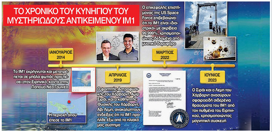 Νιώθοντας δικαιωμένοι, ο Λεμπ και ο Σιράι άρχισαν πριν από τρεις εβδομάδες ερευνητική αποστολή στην περιοχή όπου κατέπεσε το IM1, η οποία κόστισε 1.380.000 ευρώ. Την περασμένη εβδομάδα, όπως σας ενημέρωσε η «Espresso», ο Λεμπ ανακοίνωσε ότι με τη βοήθεια μαγνητικής συσκευής συνέλεξαν από τον βυθό 50 θραύσματα σε σχήμα σφαίρας, τα οποία έστειλαν για ανάλυση σε εξειδικευμένο εργαστήριο.