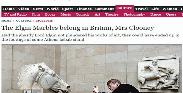 Με τον «πιασάρικο» τίτλο «Τα ελγίνεια ανήκουν στη Βρετανία, κυρία Κλούνεϊ» και τον ισχυρισμό του δημοσιογράφου Τζέρεμι Πάξμαν πως «ο Ελγιν έκανε… χάρη στην παγκόσμια πολιτιστική κοινότητα που λεηλάτησε τα γλυπτά, διότι θα μπορούσαν να είχαν καταλήξει στα θεμέλια κάποιου κεμπαπτζίδικου στην Αθήνα», κυκλοφόρησε η βρετανική «Telegraph».
