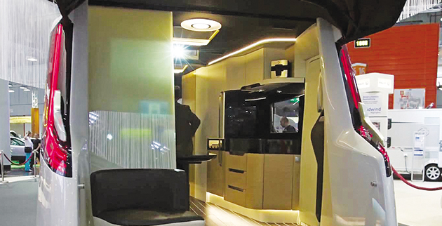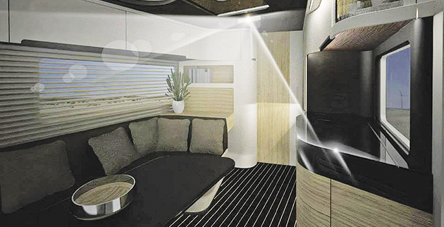 Στο μέσο του οχήματος υπάρχει ένα γυάλινο τζάμι, ως διαχωριστικό, με δύο φύλα που ανοιγοκλείνουν, αλλά αυτό το ίδιο χώρισμα λειτουργεί και ως αγωγός ψύξης. Είναι ένα αιρκοντίσιον δηλαδή. Στο υπερσύγχρονο μπάνιο του όλες οι ρυθμίσεις -για κρύο ή ζεστό νερό, για τη ροή του ντους ή τη λειτουργία της βρύσης- γίνονται μέσω ενός κοντρόλ που επίσης λειτουργεί βιομετρικά. Η τηλεόραση, όταν δεν είναι αναμμένη, μοιάζει με γυάλινο πίνακα, ένα διάφανο πάνελ που κοσμεί τον τοίχο του τροχόσπιτου.