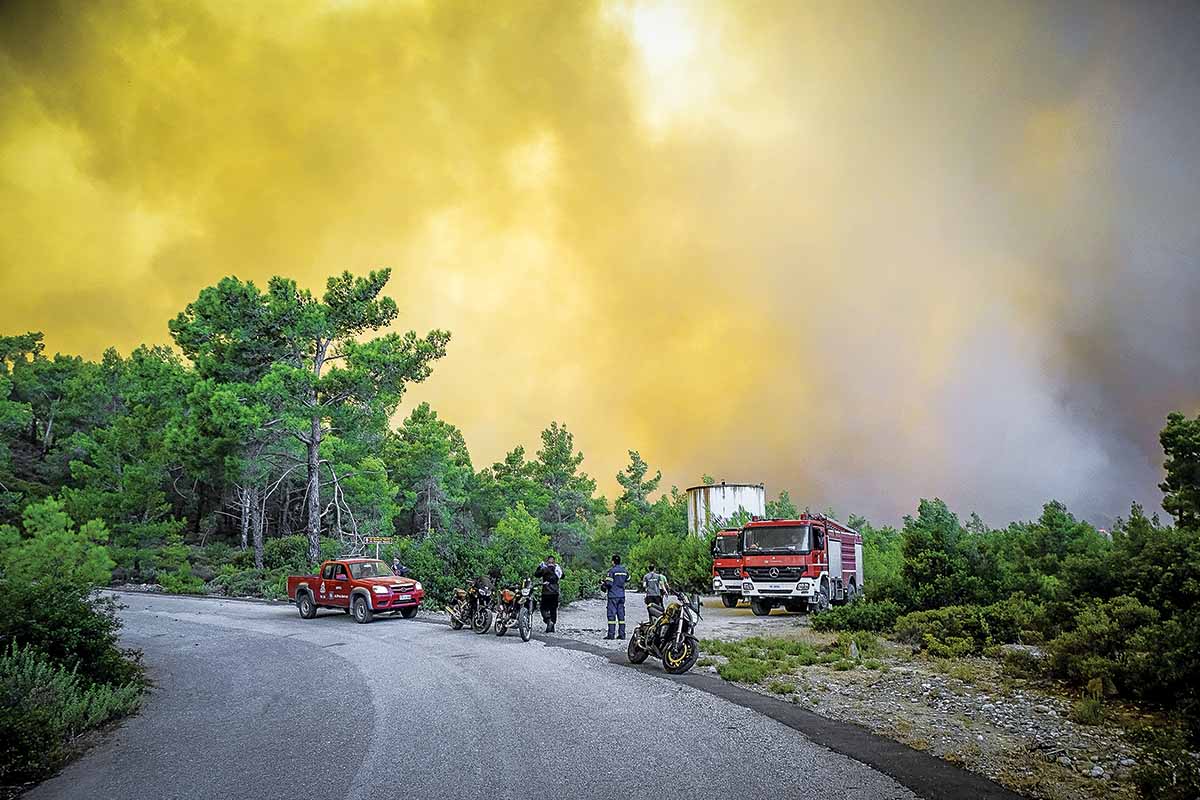 Το νησί των ιπποτών ζει εφιαλτικές στιγμές. Τα προβλήματα είναι τεράστια ακόμα και στις μετακινήσεις. Οι δυνάμεις της πυρόσβεσης επιχειρούν ασταμάτητα επί μέρες. Πυροσβέστες, αστυνομικοί, εθελοντές, στελέχη της Αυτοδιοίκησης και της πολιτικής προστασίας έχουν εξαντληθεί. Περιουσίες έχουν καταστραφεί, η οικονομική ζωή του νησιού στην καρδιά της τουριστικής περιόδου τινάχτηκε στον αέρα. Η φωτιά κατέστρεψε πάνω από 110 στύλους και τρεις υποσταθμούς του ΔΕΔΔΗΕ που προσπαθεί να αποκαταστήσει τη ρευματοδότηση με πρώτους τους παραθαλάσσιους οικισμούς και τα τουριστικά θέρετρα.
